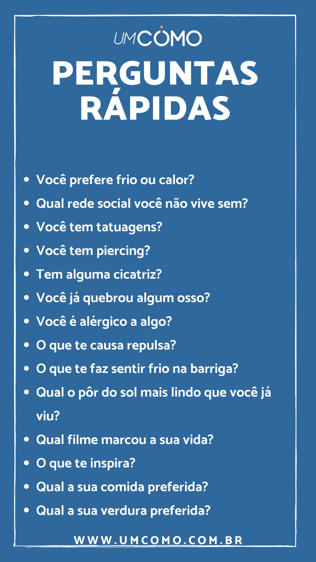 Não é da era da internet que as entrevistas ping-pong são um formato divertido e eficaz para apresentar uma pessoa ao público. Entrevistadores e jornalistas já utilizavam as perguntas rápidas em jornais, revistas e programas de entrevista na televisão. Com a internet, a ascensão de youtubers e outros veículos de comunicação, algumas sequências de perguntas rápidas passaram a ser chamadas de TAGS. Chame-as como for, são perguntas e respostas fáceis de responder na maioria das vezes. Faça o teste! Neste post do umCOMO reunimos 100 perguntas para responder rápido que sempre funcionam e ajudam a conhecer uma pessoa melhor.
