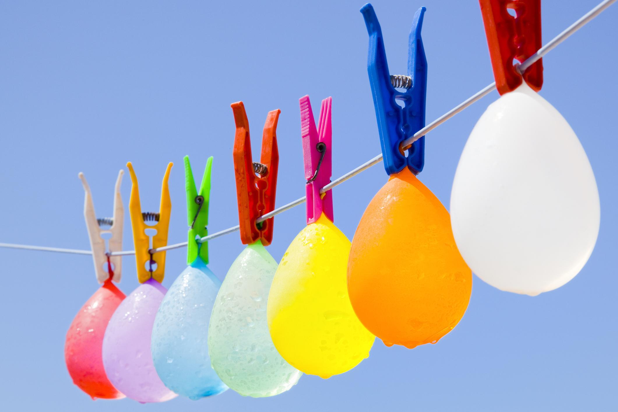 Arrume os balões grandes em um barbante como se estivesse estendendo as roupas. Se as crianças quiserem receber recompensas, terão que se molhar: deverão furar os balões para ganhar os brindes.