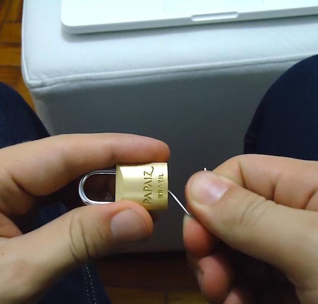 Provavelmente você não abrirá o cadeado à primeira, pois é tudo uma questão de timming. Ou seja: você terá de tentar várias vezes pois, de cada vez que você dá o golpe, os pinos no interior do cadeado sobem, e em algum momento eles hão-de estabelecer o padrão necessário para abrir o cadeado.