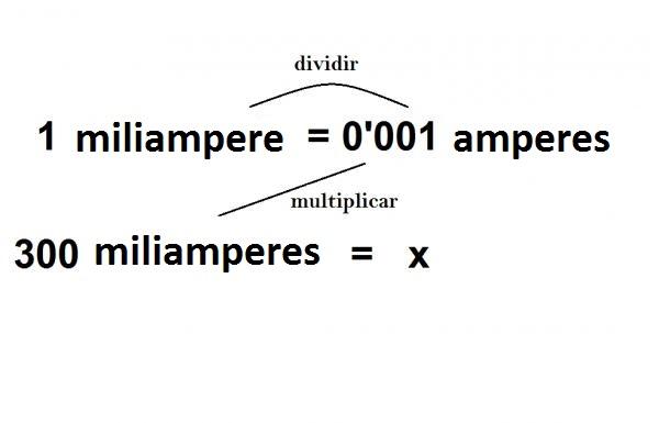 No exemplo usado, vamos colocar o "x" de parte e multiplicar os 300 miliamperes por 0'001 amperes e dividir depois por 1 miliampere (podemos esquecer este último passo, uma vez que os valores que se dividem por um não variam).