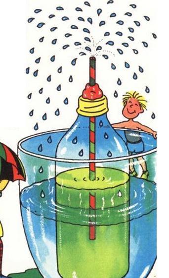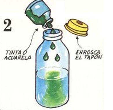 Em seguida deite umas gotas de corante ou tinta na água da garrafa. Feche a garrafa e aperte bem a tampa da garrafa.