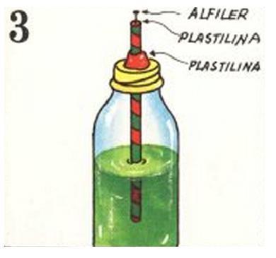 Introduza um canudinho através do buraco. Coloque plasticina à volta para ficar bem selado. Ponha uma tampa de plasticina no canudinho e faça um buraco com uma agulha.