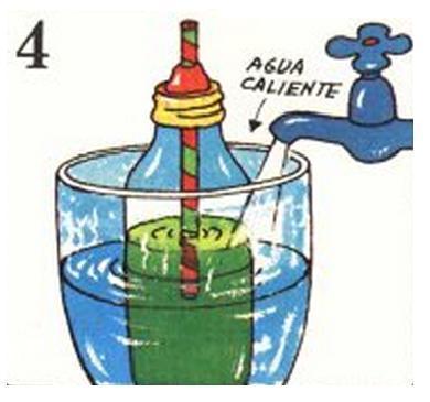 Para finalizar ponha a garrafa numa panela cheia de água muito quente. Espere um momento para que o dispersor funcione.