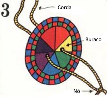 A seguir faça dois buracos no círculo, com uma distância de 2 cm entre eles. Introduza as pontas de um pedaço corda (fio) com um metro de comprimento pelos buracos. Ate as pontas.