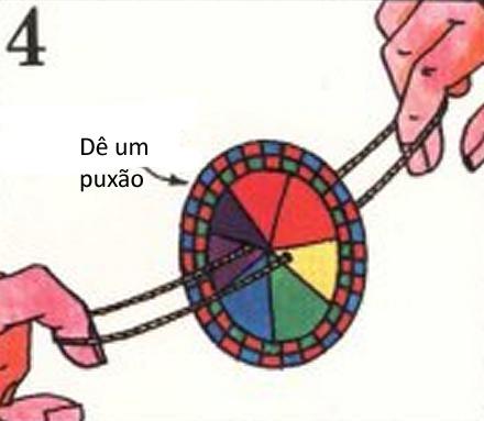 Para finalizar, pegue na corda como mostra a imagem. Gire o círculo para que a corda se enrole. Estique os dedos e deixe que a corda se vá desenrolando. Isto fará girar o círculo.