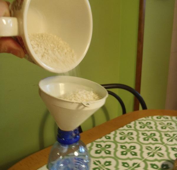 A seguir, com a ajuda de um funil, coloque todo a arroz dentro de uma garrafa de água vazia.