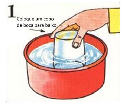 Um copo vazio parece que não tem nada lá dentro. Para comprovar que está cheio de ar, coloque-o de boca para baixo dentro de um recipiente com água, como na imagem. O ar impede quase completamente que entre água para dentro do copo.