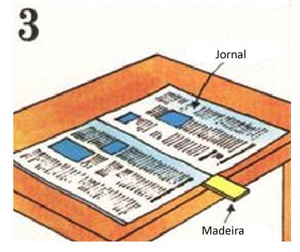 Esta é outra experiência com ar. Coloque uma barra de madeira sobre a mesa, com um pedaço de fora da borda da mesa. Estenda duas folhas de jornal sobre a mesa e a madeira e estique para que fique bem liso.