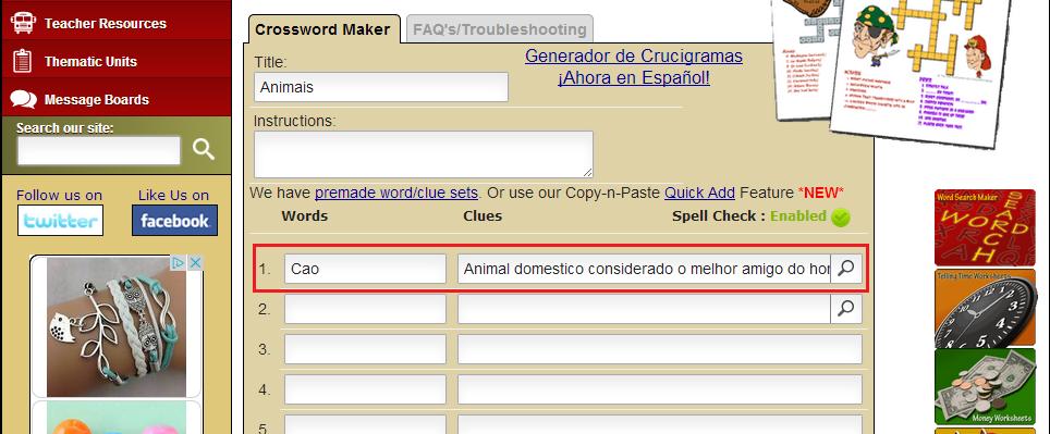 De seguida, escrevas todas as palavras que quer que saiam no seu quebra-cabeças (poderá introduzir um máximo de 30 palavras). Cada palavra deve ser introduzida com a respetiva pista. A pista deve ser colocada no campo à frente da palavra. Por exemplo, se a palavra é CÃO a pista poderia ser animal doméstico que é considerado como melhor amigo do homem. Por ser um programa em inglês, escreva todas as palavras e pistas sem acentos, porque estes não aparecerão.