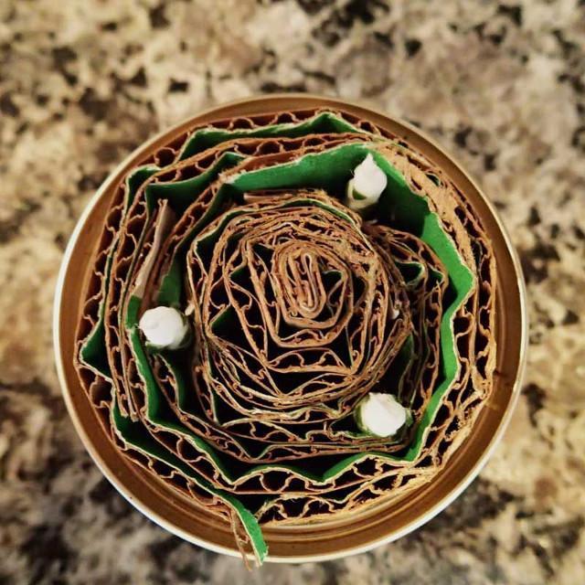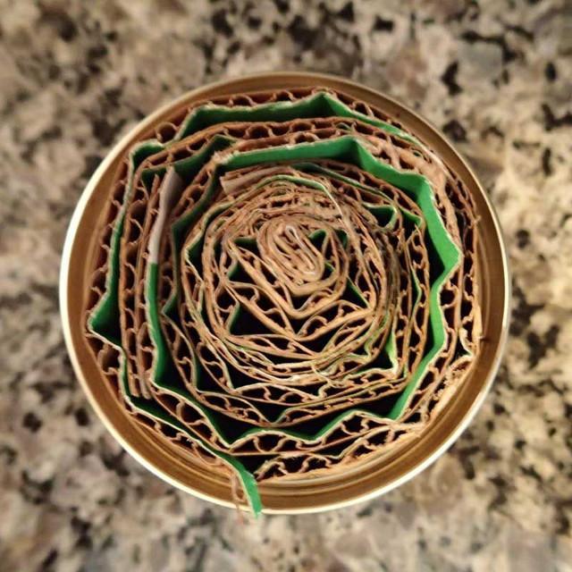 Comece o fogão de acampamento cortando tiras de papelão da mesma altura que a lata pequena. Enrole as tiras de papelão e coloque-as dentro da lata.