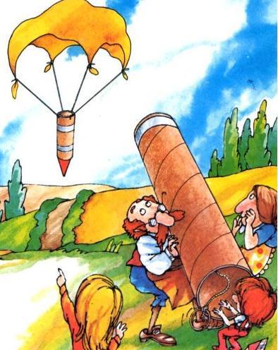 Para fazer um paraquedas de socorro, amarre fortemente um pedaço de linha aos quatro extremos do pedaço de tecido. Cole os extremos das quatro peças de linha à boca do foguete pequeno como você pode ver no desenho. Certifique-se de que as linhas não deem nó entre elas.