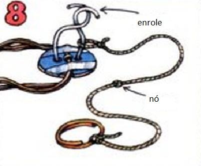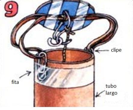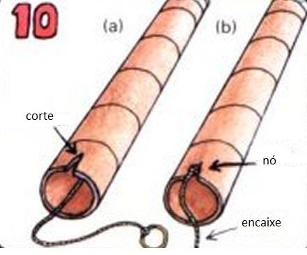 Faça alguns cortes ou buracos nos lados da base do tubo (a). Puxe a corda para baixo até que se veja o nó. Encaixe o nó no buraco e solte a corda (b).