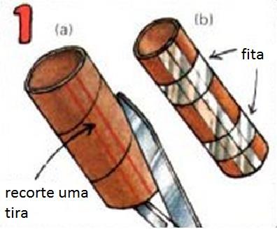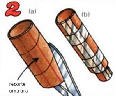 Depois recorte uma tira larga do outro tubo pequeno (a). Segure bem as bordas com fita adesiva e meta dentro do primeiro tubo (b).