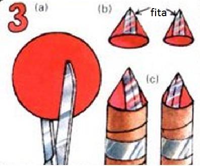 Recorte um círculo pequeno de cartolina. Corte pela metade (a). Dê a cada metade a forma de um cone e segure as bordas com fita adesiva (b). Cole um cone à parte superior de cada tubo (c).