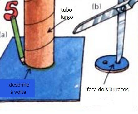 Coloque o tubo longo sobre o papelão e desenhe um círculo ao redor usando sua base como guia (a). Recorte este círculo um pouco menor do que a linha desenhada e faça dois buracos nele (b).