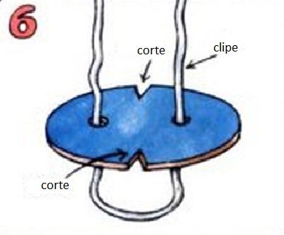Corte dois pequenos triângulos dos lados do círculo de papelão. Endireite um clipe e meta os dois extremos pelos buracos do círculo. Faça-o como no desenho.