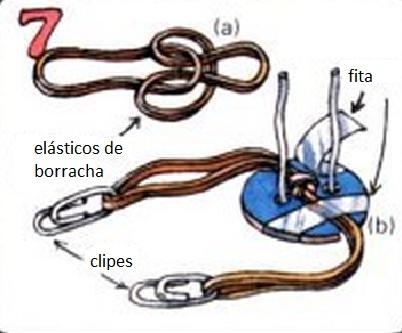A seguir amarre dois elásticos de borracha (a). Coloque sobre o círculo, por cima dos triângulos que você recortou (b). Fixe aqui com fita adesiva e coloque um clipe em cada ponta do elástico.