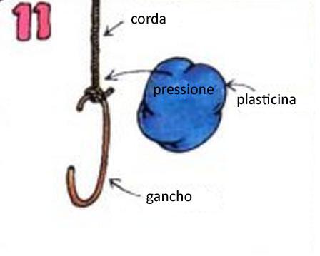 Depois dobre a corda em forma de gancho por uma ponta e de anel pela outra. Amarre a ponta da terceira corda ao anel. Cole muita plasticina ao anel e ao nó.