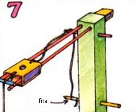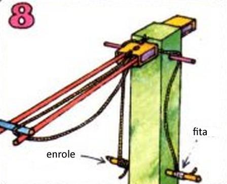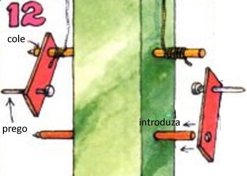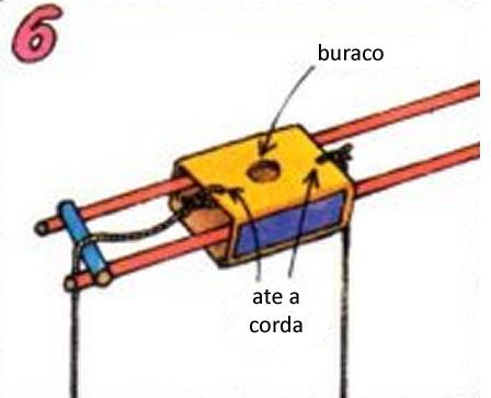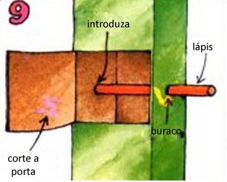 A seguir, recorte uma porta na caixa fina e amarre por baixo do lápis. Enfie outro lápis atravessando a caixa de lado a lado. Veja o desenho.