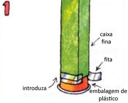 Primeiro recorte um dos extremos. Cole o lado aberto da caixa com fita adesiva. Coloque dentro uma embalagem de plástico, introduzindo-a pela parte inferior da mesma. Fixe bem com fita adesiva.