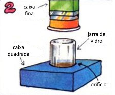 Depois faça um orifício redondo na caixa quadrada. Coloque dentro a jarra de vidro. Ajuste a embalagem de plástico em cima da jarra. Esta é a base do guindaste e deve girar de um lado para o outro com facilidade.