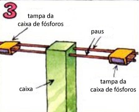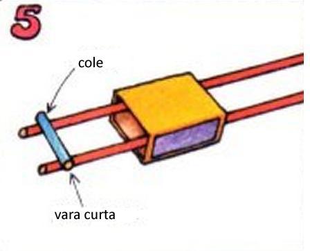 Deslize a tampa de uma caixa de fósforos sobre as duas varas compridas. Faça buracos nas laterais da caixa fina e passe por eles as varas compridas. Faça o mesmo na outra ponta.
