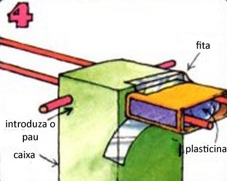 Depois fixe com fita adesiva uma tampa de caixa de fósforos na caixa fina. Coloque dentro muita plasticina. Faça buracos na parte de cima da caixa e coloque uma varinha curta.