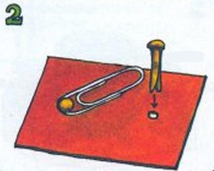 Primeiro de tudo, faça um pequeno buraco em um pedaço de papelão. Mantenha o final do clipe por cima do buraco e coloque um pino. Dobre as pontas para trás por debaixo do papelão.