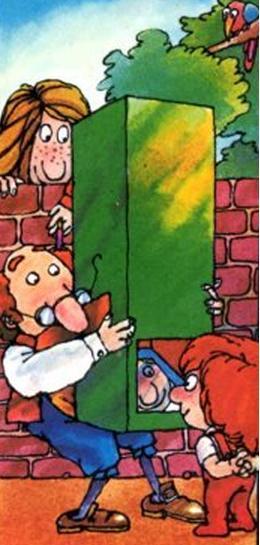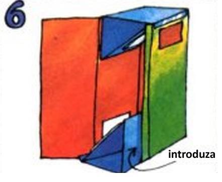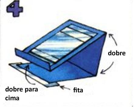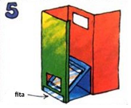 Para terminar, coloque a caixa com a boca para baixo. Coloque o outro triângulo de maneira a que se consiga ver o espelho através da janela. Cole-o bem com fita adesiva. Feche a caixa e cole as pontas do triângulo por baixo.
