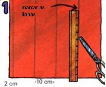 Para começar meça quatro colunas de uns 10 cm de largura e uma de 2 cm de largura na folha grande de papelão. Coloque a régua sobre cada linha e passe a tesoura por cima para as marcar.