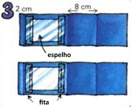 De seguida, meça três colunas de 8 cm de largura e uma de 2 cm de largura sobre as duas tiras de papelão. Marque as linhas e cole com fita adesiva um espelho sobre cada uma. Veja o desenho.