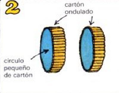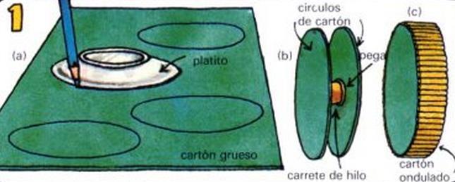Primeiramente, desenhe quatro círculos sobre o papelão, usando um pires como guia. Recorte-os. Cole um círculo a cada ponta do carretel. Cole os outros dois círculos a um segundo carretel. Cole uma tira de papelão ondulado em volta das bordas dos dois círculos de papelão. Faça o mesmo com os outros dois círculos.