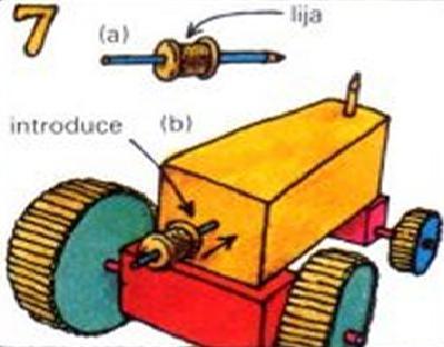 Cole a caixa sem tampa ao eixo traseiro. Prenda com fita adesiva duas varas com uns 26 cm de comprimento aos dois cantos. Introduza as duas varas de 15 cm de comprimento na caixa que faz de motor. Veja o desenho.