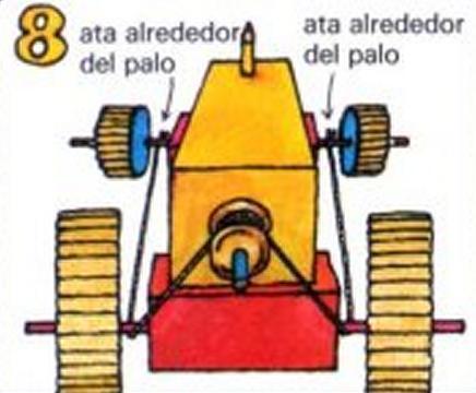 Enrole um pedaço de corda à volta do carretel. Ate um extremo a um lado do eixo dianteiro, passando-o antes por baixo do eixo traseiro. Pegue no outro extremo e faça a mesma operação. Devem ficar bem tensos.