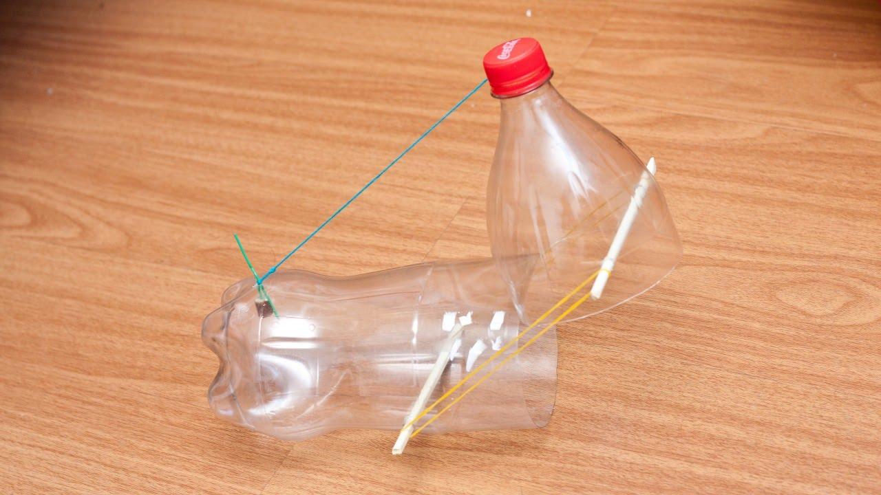 Terminando a armadilha para ratos ela ficará com o gargalo levantado por cima da outra metade, sendo segurada pelo fio barbante preso entre a tampa e a ponta do arame saindo do fundo da garrafa. Os elásticos irão servir como molas, assim que o barbante deixe o arame eles vão puxar a parte de cima da garrafa e uni-la à outra metade, prendendo o rato dentro da garrafa.