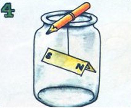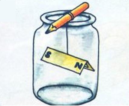 Se você quiser levar a bússola para fora de casa, pendure o papel com um fio, amarre o fio em um lápis e deixe o papel pender dentro de um recipiente de vidro, como no desenho.