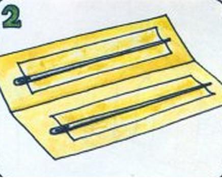 Depois esfregue-o em uma segunda agulha da mesma forma. Dobre a tira de papel em duas metades e prenda as agulhas nela com fita, como se vê no desenho. Ambas as agulhas devem apontar na mesma direção.