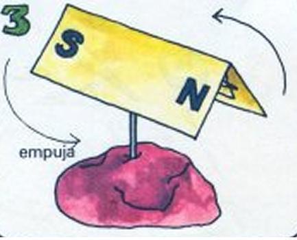 Depois empurre uma terceira agulha para dentro de um pequeno monte de massa de modelar. Equilibre o papel em cima da agulha para que possa girar. Marque uma extremidade do papel com um S e a outra com um N.