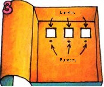 Abra a porta da caixa e corte três janelas na parte da frente, perto da parte superior da caixa. Faça um furo por debaixo de cada janela.