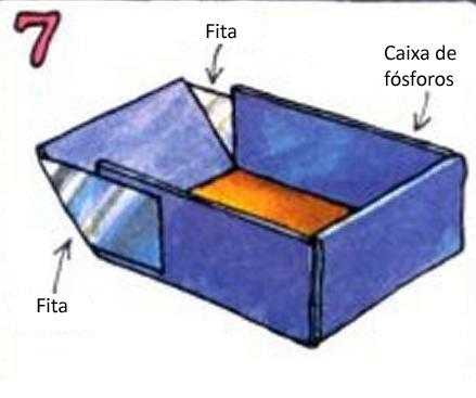 De seguida, corte os dois cantos da parte de dentro da caixa de fósforos. Dobre a ponta para baixo. Coloque fita adesiva para segurar os cantos, tal como vê na imagem.
