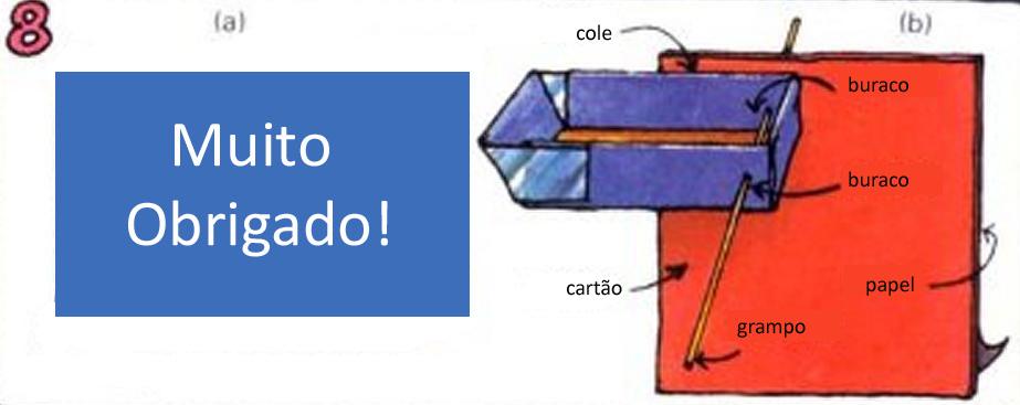 Corte um pedaço de papel ligeiramente maior do que o tabuleiro da caixa de fósforos. Escreva "Muito obrigado" nele. Cole-o a um pedaço de cartão do mesmo tamanho (a). Cole um canto do cartão a um canto do tabuleiro da caixa de fósforos, como no desenho. Faça furos nos dois. Endireite um grampo e passe-o pelos furos (b).