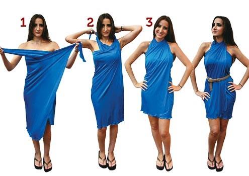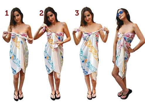 Existem outras opções que não necessitam sequer de costura. É só pegar aquela canga que você se cansou de usar, e adequá-la de diversas formas