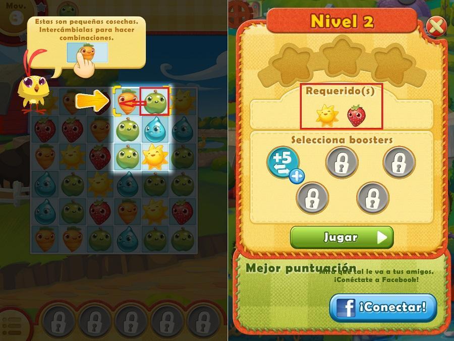 Como acontece com Candy Crush, os movimentos são limitados e deverá completar os níveis utilizando o número de movimentos necessários. Cada nível tem um número diferente e deverá mover os vegetais de maneira estratégica para superá-lo. Olhe no painel para conseguir juntar o máximo de vegetais possível no menor número de movimentos. Por exemplo, na imagem vemos como com um só movimento podemos juntar as maçãs e as cenouras. Antecipar-se aos movimentos é essencial para superar os níveis com sucesso, por conseguinte, pense nos vegetais que moverá depois de realizar um movimento.