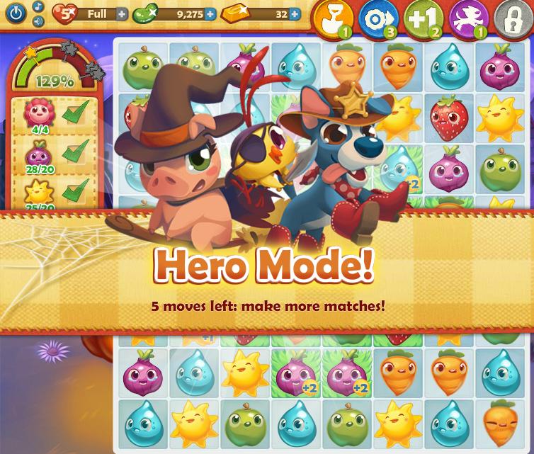 O Modo Herói ativa-se quando tiver atingido os objetivos do nível antes de gastar todos os movimentos. Quando aparece, tem a possibilidade de conseguir mais pontos juntando os vegetais que contam com o 1, 2, 3, etc., no canto direito.