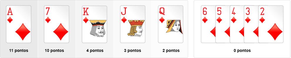 Cada naipe é composto por 10 cartas, que vão do Às ao duque, sendo o Às a carta mais alta e o duque (2) a carta mais baixa.