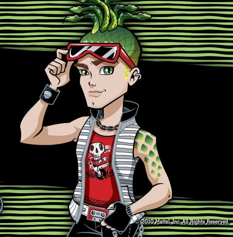 Entre as Monster High, também encontramos personagens masculinos como é o caso de Deuce Gorgon, o noivo de Cleo. Este personagem é o filho de Medusa, a górgona da mitologia clássica, de onde deriva o seu poder de converter em pedra tudo para onde olha, por isso usa óculos de sol.