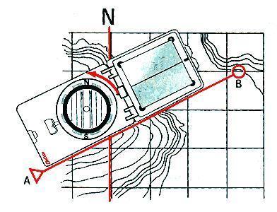 Anote o ângulo que aparece ao pé da seta de direção, pois este será o seu Azimute e gire a bússola até que a parte vermelha da agulha (Norte) coincida com a seta de direção. Desta forma, o seu destino ficará fixado pela seta de direção da bússola.