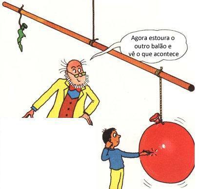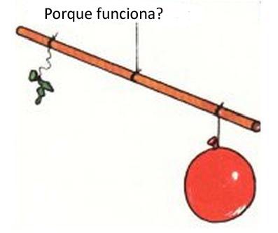 Funciona porque quando você estoura um balão, sai o ar todo. O outro balão cheio de ar pesa mais do que o vazio, e é por isso que o cabo se inclina.