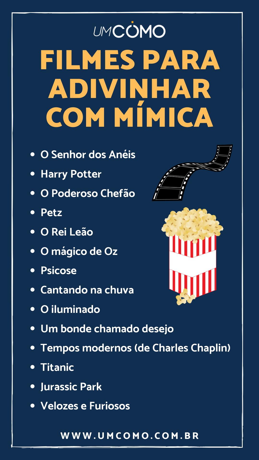 Para uns, jogar mímica sem adivinhar nomes de filmes é o mesmo que comer misto quente sem pão! Aqui listamos uma grande diversidade de filmes para adivinhar com mímica: dos maiores clássicos do cinema aos principais líderes de bilheteria mundial e brasileira: