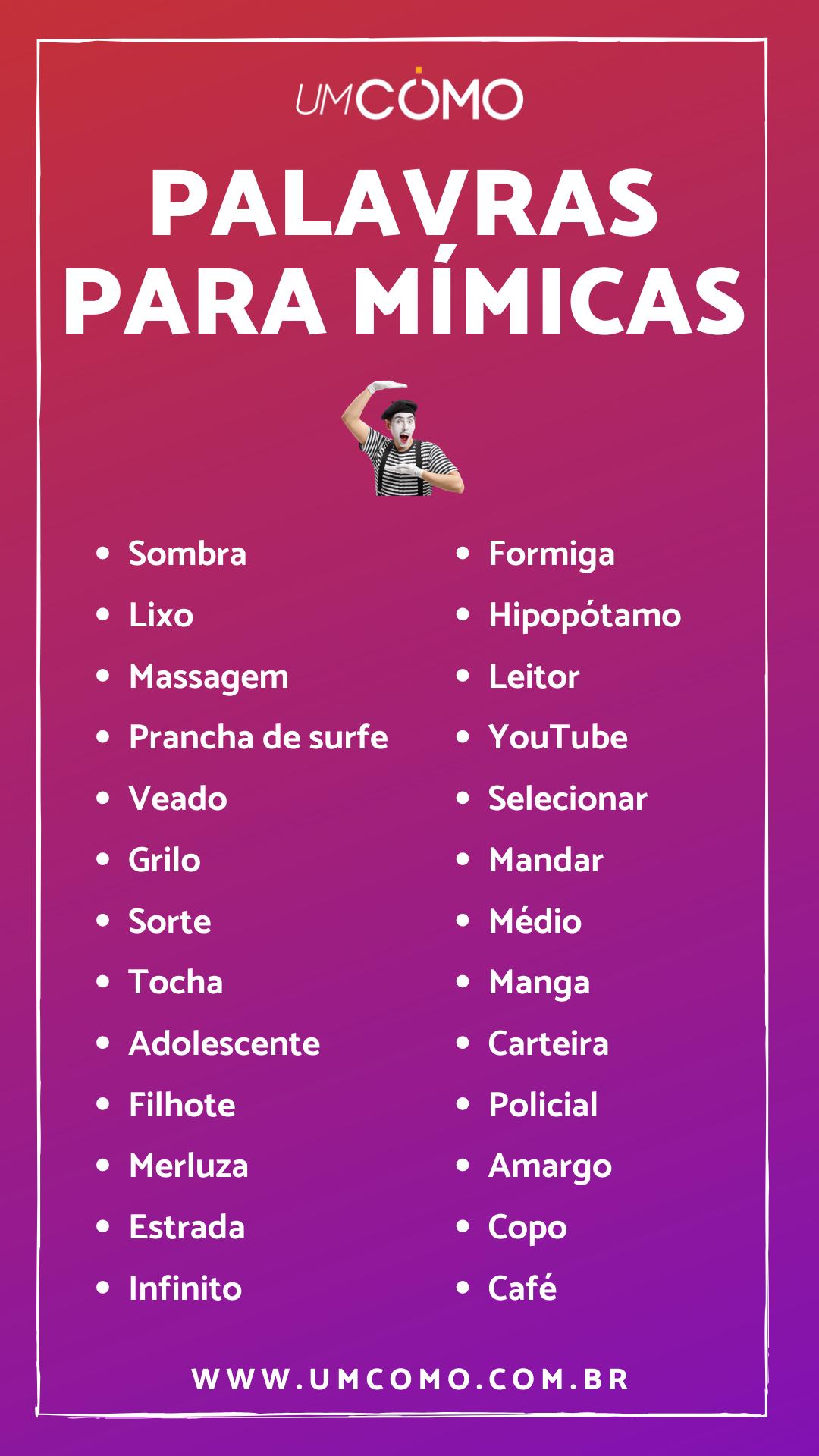 Agora, se você é um profissional da mímica e tirou as sugestões anteriores de letra, te desafiamos a jogar mímica com as palavras de nível difícil! Será que sua equipe vai adivinhar essas charadas?